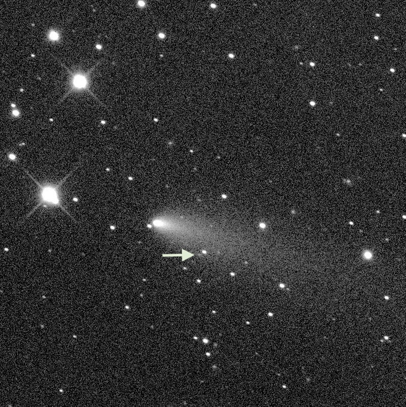 764. COMET 240P/NEAT Perihelion: 2025 December 19.95, q = 2.122 AU This is the second of two comets (that I alluded to in the previous entry) that I added to my tally in order to -- belatedly -- mark the 30th anniversary of my discovery of Comet Hale-Bopp C/1995 O1 (no. 199). It is a short-period object, originally discovered by the NEAT program in late 2002, that I have seen on two previous returns: I observed it in late 2010 (no. 483) as a very faint object during the course of "Countdown," and I observed it again in 2017 (no. 627) when it underwent an apparent outburst nine months before perihelion. In the descriptions I wrote for both of those returns I mentioned that the viewing geometry during this year's return is especially favorable, however in view of my "retirement" from systematic visual observational activities, and especially in light of the seemingly erratic behavior it exhibited during its 2017-18 return, I considered it unlikely I would be observing it this time around. On its current return Comet 240P was recovered as long ago as June 13, 2024 by the Pan-STARRS program in Hawaii. During recent weeks I have seen brightness reports as well as various images that suggested it is currently somewhat bright, and shortly after mid-July I took some images of my own via the Las Cumbres Observatory network that, in addition to showing a distinct tail, suggested it might be bright enough to attempt visually. On the morning of July 27 I successfully detected it as a relatively vague and diffuse object slightly brighter than 14th magnitude. The comet is currently located in far northwestern Eridanus about two degrees south of the star 94 Ceti and is traveling slightly northward of due east at approximately 20 arcminutes per day. It reaches its stationary point during the second week of October, after which it crosses into Taurus and begins retrograde (westward) motion. After going through opposition shortly after mid-November it is nearest Earth (1.16 AU) on the 24th of that month, then passes through its other stationary point in early January 2026, when it briefly crosses into Aries and resumes direct (eastward) motion. Now traveling towards the east-northeast, the comet crosses back into Taurus at the end of January and passes two degrees north of the Pleiades star cluster (M45) in mid-February. If Comet NEAT behaves "normally" it should brighten by perhaps two magnitudes by around the time it is at opposition and nearest Earth, and remain visually detectable until perhaps March 2026. But, given its past behavior there is no real way to know at this time whether or not it will in fact behave "normally;" it could, conceivably, be even brighter when it is near opposition and perihelion, or (I would think more likely) be distinctly fainter, and I would not rule out the possibility that it will fade dramatically and even disintegrate by that time. The only real way to know is to see what it does, and I suspect I will continue to take occasional images of it via LCO and, if these indicate it is worthwhile, might continue to make occasional visual observations as well. INITIAL OBSERVATION: 2025 July 27.42 UT, m1 = 13.7, 1.0' coma, DC = 1-2 (41 cm reflector, 229x) UPDATE (October 16, 2025): I have managed to obtain a couple of more observations of Comet NEAT since my initial sighting in late July, although since it is quite faint and until now has primarily been visible in the morning sky, it has been a rather low-priority object for me. As of my recent observation at this writing, which I obtained in late September, it had brightened slightly, to about 13th magnitude. Meanwhile, in early October Vivian Carvajal with the Catalina Sky Survey in Arizona reported her discovery of a faint companion comet traveling alongside Comet NEAT -- obviously a fragment of the primary object. After I read of her report I examined images I had previously taken of Comet NEAT via the Las Cumbres Observatory network, and succesfully found this companion object on images I had taken on September 17, although I have been unable to find it on images I took in late July. I have just recently taken some additional images of Comet NEAT, including some with longer exposure times, and these show the fragment -- now designated as Component "B" -- rather well, with a tail structure that appears to mimic that of the primary component. The fragment is about 18th magnitude, obviously too faint for any meaningful visual attempts.