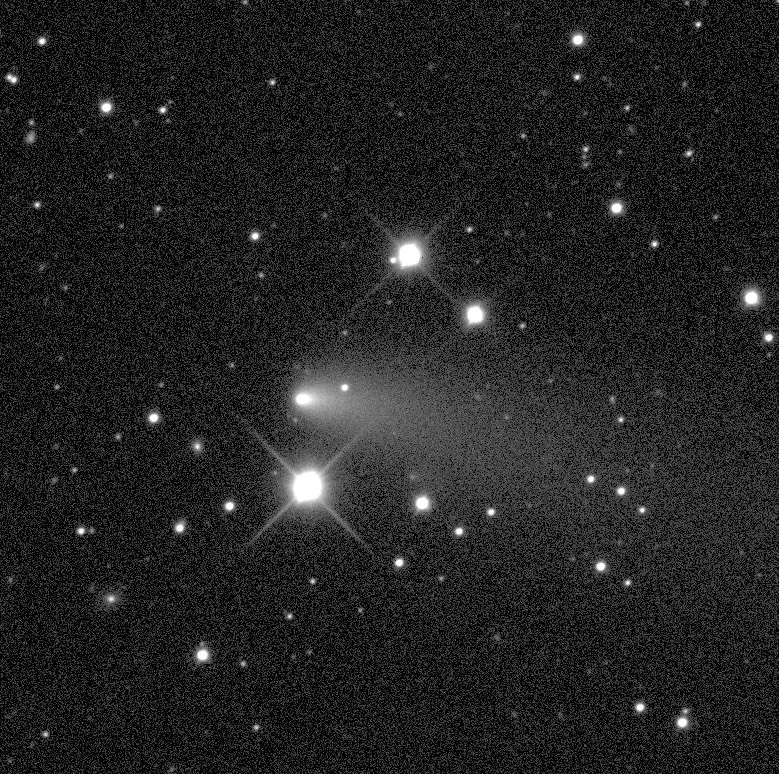 767. COMET WIERZCHOS C/2024 E1 Perihelion: 2026 January 20.77, q = 0.566 AU Throughout all the decades I have been observing comets, my friendships with the various members of the international comet "community" have been very important to me. One of the newer members of this "community," with whom I became friends a few years ago (even though we have never met in person), is Kacper Wierzchos, a native of Poland who later emigrated to Spain and then the U.S., and after completing his Ph.D. at the University of South Florida in 2019 later that year began working with the Catalina/Mount Lemmon Survey in Arizona. He discovered his first comet late that year, a faint periodic object (P/2019 Y3) that was nevertheless assigned the name "Catalina;" it returned early this year (and has now been numbered as Comet 499P) under favorable geometrical conditions, and while it never became bright enough for visual attempts, I succeeded in imaging it with the Las Cumbres Observatory network on several occasions. During his time with the Catalina/Mount Lemmon Survey Kacper has discovered numerous asteroids, the most notable of these (which he co-discovered with Theodore Pruyne in February 2020) being 2020 CD3, which turned out to be a tiny temporary "moon" of Earth (and which I discuss near the end of one of my presentations in "Ice and Stone 2020"). As of this writing he has discovered 7 comets that have received his name, the first of these being C/2020 H3 in April 2020, a faint and relatively distant long-period object. Like the large majority of comets discovered by the comprehensive survey programs these days, most of Kacper's other comets have also been faint and/or distant objects. His fifth comet, which he discovered on March 3, 2024, during the course of the Mount Lemmon survey, has, however, turned out to be much more interesting. It was a relatively faint object of 20th magnitude when discovered, and was found to be located just over 8.0 AU from the sun, almost two years away from perihelion passage which would take place at a rather small heliocentric distance, which in turn suggested the potential of a bright, possibly naked-eye, display. Observations and calculations since then suggest that it is likely a first-time visitor from the Oort Cloud (although the gravitational perturbations it will encounter during its passage through the inner solar system will place it into an elliptical orbit with an approximate period of 200,000 years), and observations obtained in June 2024 with the James Webb Space Telescope suggest that it is significantly depleted in carbon monoxide and thus has a rather unusual chemical composition as far as comets go. I began imaging Comet Wierzchos with the LCO network just a few days after its discovery, and did so on an occasional basis for the next couple of months. After it went through conjunction with the sun (63 degrees north of it) in early December 2024 I began imaging it again in March 2025, and have continued doing so on a semi-regular basis ever since. It seemed to brighten fairly dramatically during the middle months of this year, to the point where I made a visual attempt in late August -- unsuccessfully. (This was my first unsuccessful visual comet observation since my "retirement," and my intent has been that these would be very few in number.) The comet seemed to stagnate in its brightness for a while after that, but some images I obtained shortly before mid-October suggested it might be worth attempting again, and on the evening of the 15th I successfully detected it as a faint, somewhat "solid" object of 13th magnitude.