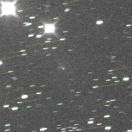 772. COMET P/(139359) P/2001 ME1 Perihelion: 2001 August 12.36, q = 0.357 AU Once again, I add a comet to my tally retroactively, an object I briefly observed as an "asteroid" on a single night almost a quarter-century ago. It was discovered on June 16, 2001 by the LINEAR program in New Mexico, already a somewhat bright object near 14th magnitude. I happened to be in Zimbabwe at that time, in order to observe the total solar eclipse that took place on June 21, but after my return a few days later I tried to make plans to observe it. The evening of the 25th started out cloudy, but towards midnight I saw that the sky had cleared somewhat, and despite the fact that its altitude was starting to get somewhat low and the conditions still weren't ideal, I managed to spot 2001 ME1 as a stellar object near magnitude 14 1/2 (although given the conditions I considered this somewhat uncertain and suspected that it might have been slightly brighter than that). I was only able to follow it for about eight minutes before clouds moved in again, but during that time I detected clear motion (as it was then traveling at over seven degrees per day). At the time of my observation 2001 ME1 was located 0.110 AU from Earth, and it passed 0.097 AU from Earth on the 29th (which, incidentally, puts it in 13th place on the list of closest-approaching comets on my tally). It rapidly moved inside Earth's orbit and accordingly faded quickly, and this, combined with its rapidly-shrinking elongation as well as increasing moonlight in the evening sky kept me from attempting to observe it again. The final ground-based observations before it disappeared into sunlight were obtained on July 4, and it was later picked up as a faint object in mid-January 2002. After observations were obtained around the time of its subsequent perihelion passage in December 2005 it was assigned the permanent number (139359) in December 2006. (139359) 2001 ME1 travels in an orbit with a period of 4.3 years and an eccentricity of 0.87, which can be considered "cometary." The cometary nature of its orbit was evident at the time of its discovery announcement, and even in my observing notes for my observation I put the word "asteroid" in quotation marks, in anticipation of the possibility that it might actually be found to be a comet at some point. For the next couple of decades it was never observed as cometary, however just over a year ago it was identified as a member of a recently-christened class of objects called "dark comets," i.e., apparent "asteroids" that exhibit non-gravitational forces indicative of a cometary nature but not exhibiting cometary activity. In my statistical analysis that I completed after my "retirement" from systematic visual observing at the end of 2024 I specifically mentioned it in this context as a reasonable candidate for a retroactive addition to my tally someday. In a just-published paper written by Qicheng Zhang at Lowell Observatory and his colleagues, the authors identified (139359) 2001 ME1 with a comet that was discovered by Thai researcher Worachate Boonplod in images taken by the LASCO C2 and C3 coronagraphs aboard SOHO shortly after mid-November 2018. The authors then were able to identify it in images taken with one of the Heliospheric Imager instruments aboard the STEREO-A spacecraft, and in ground-based images taken in early December 2018 by the Zwicky Transient Facility (ZTF) survey in California, where it initially appeared marginally cometary. They have also identified it in STEREO-A images taken in July and August 2014 and it also appeared marginally diffuse in ZTF images taken in March 2023. At the time of the LASCO and STEREO observations in 2018 it appeared at a very high phase angle (peaking at 176 degrees) which accordingly produced strong forward scattering of sunlight and a distinct cometary appearance. The identification as a comet seems solid, although the data indicate a very low activity level (a small fraction of 1% of the activity level of a more typical cometary nucleus of a similar size). The orbit has apparently been relatively stable for several millennia and the repeated close passages to the sun have apparently all but depleted its supply of volatile materials.